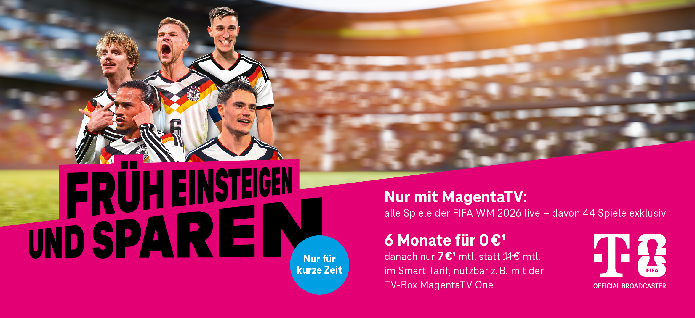 1) Aktion gilt bis 30.04.2026 für MagentaTV Neukunden. MagentaTV Smart kostet in den ersten 6 Monaten 0 €/Monat, vom 7.–24. Monat 7 €/Monat und danach 11 €/Monat. Mindestvertragslaufzeit 24 Monate. MagentaTV ist über die MagentaTV App ohne zusätzliche Hardware empfangbar. Auf Wunsch kann die TV-Box MagentaTV One für 5 €/Monat zzgl. 6,95 € Versandkosten mit einer Mindestvertragslaufzeit von 12 Monaten gemietet werden. Alle Preise inkl. der gesetzlichen MwSt. Voraussetzung für die Nutzung ist eine bestehende Internetverbindung. Für die Internetverbindung gelten die Bedingungen des jeweiligen Internetanbieters. Bei Nutzung über das Mobilfunk-Datennetz erfolgt die Belastung des Datenvolumens beim jeweiligen Mobilfunk-Anbieter.